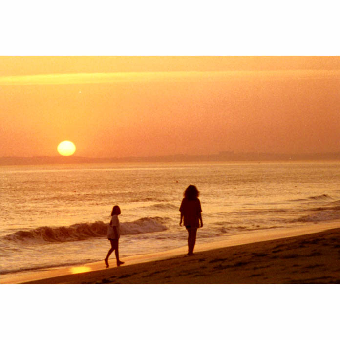 Passeio à beira mar com o Sol a pôr-se no horizonte